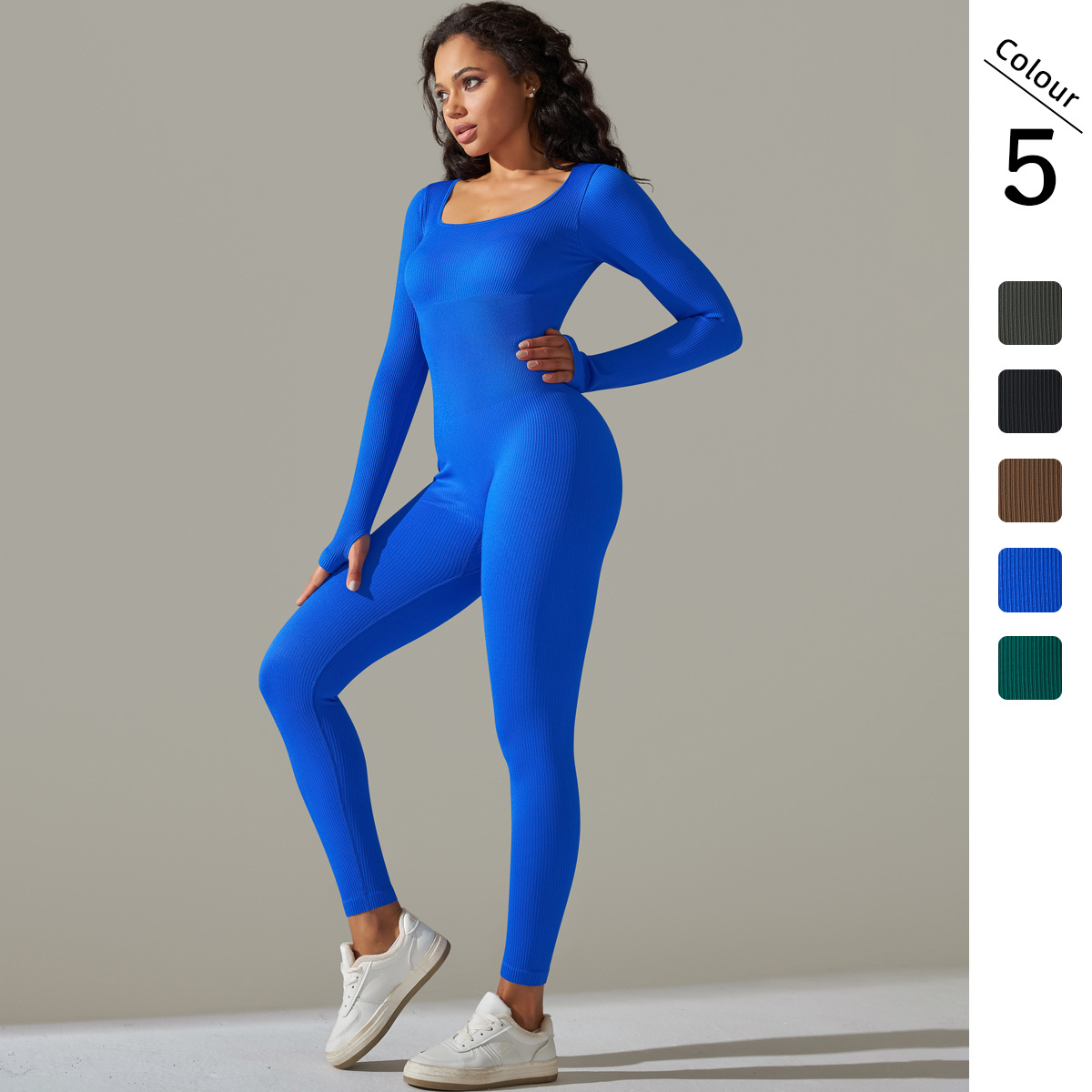 Sewn Threaded High Stretch Solid Colour Skinny Long Sleeve Exercise Running Fitness Yoga Jumpsuit